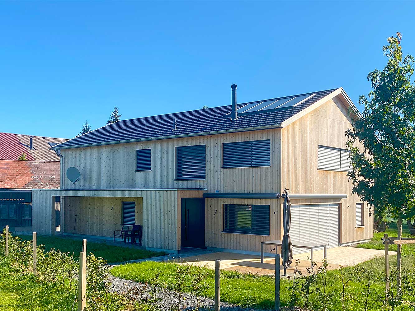 Da die Bregenzerwälder Bauherrin auf eine gehobelte Fassade bestand und den Bauherrn überzeugte, sollte es doch keine Industriefassade sein, deren Herkunft unklar ist. Heimisches Holz sollte es schon sein. Gefunden haben sie den gehobelten „Schirm“ dann im Großen Walsertal bei der Bergholz-Säge von Erhart Holz in Sonntag.